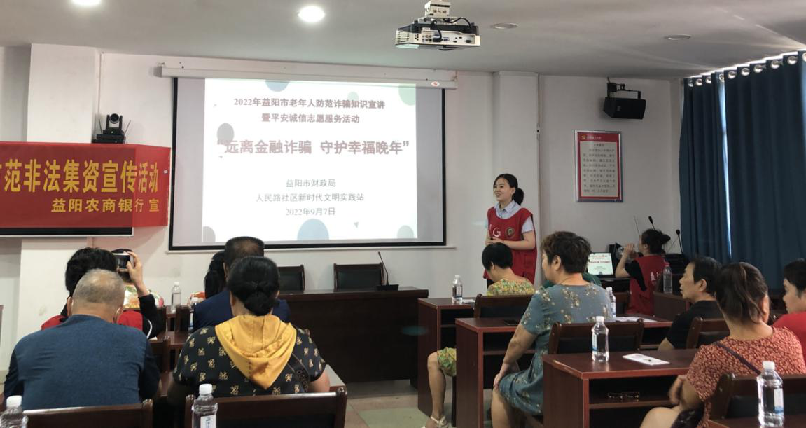 活动中,志愿者们盛饭、添菜、打包,引导来爱心食堂用餐的老人入座。对身体不便的老人,大家将饭菜放入保温箱,送餐上门。分工明确,热情娴熟,为社区老人提供了周到暖心的服务。在社区新时代文明实践站,一场以“远离金融诈骗 守护幸福晚年”为主题的宣讲活动同步进行。市财政局邀请了益阳农村商业银行的宣讲员为老人们讲解电信诈骗手段、防范措施等知识,详细介绍了“缴纳养老金”诈骗、“以房养老”诈骗等案例,用贴近生活的互动问答提醒老年人要树立防范意识,遇事多找子女商量,不要轻信别人的话。
