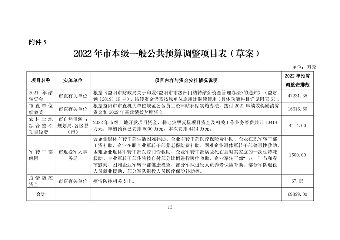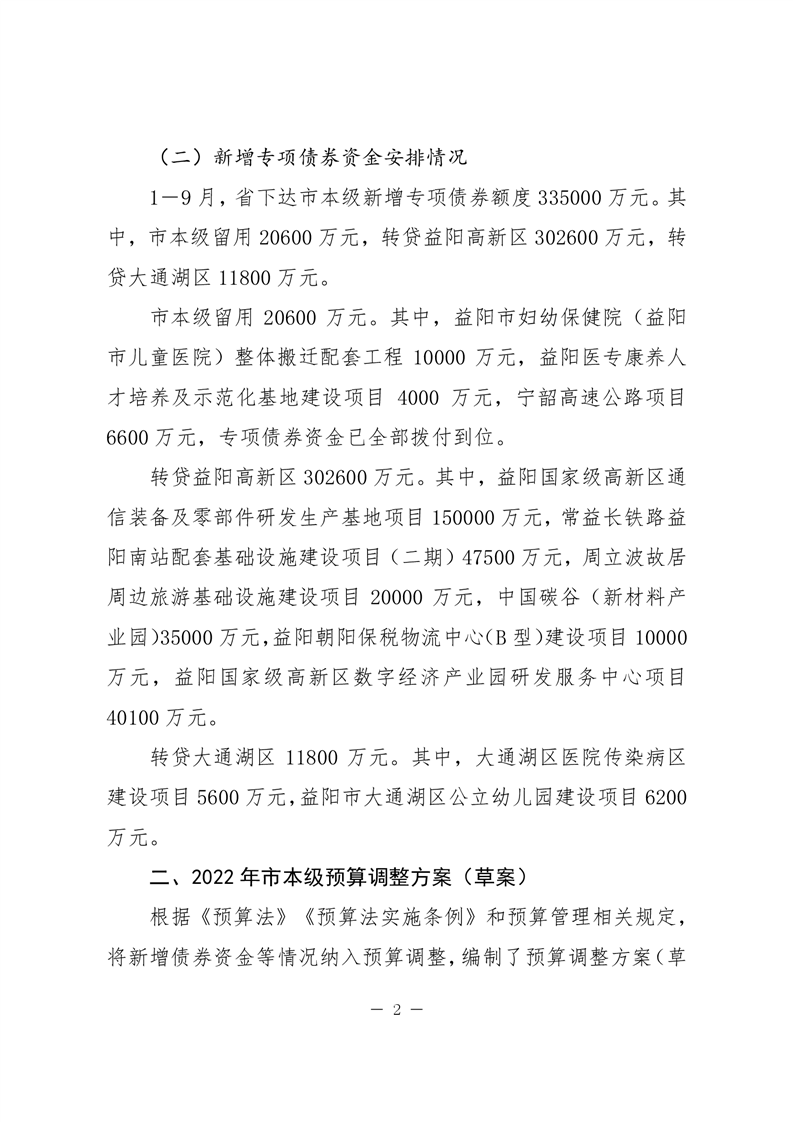 关于2022年市本级及益阳高新区和大通湖区预算调整方案(草案)的报告