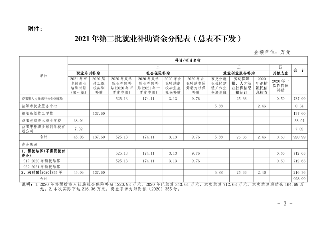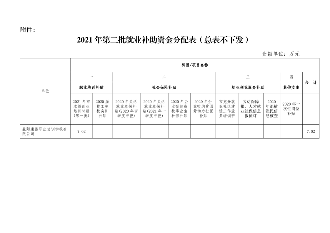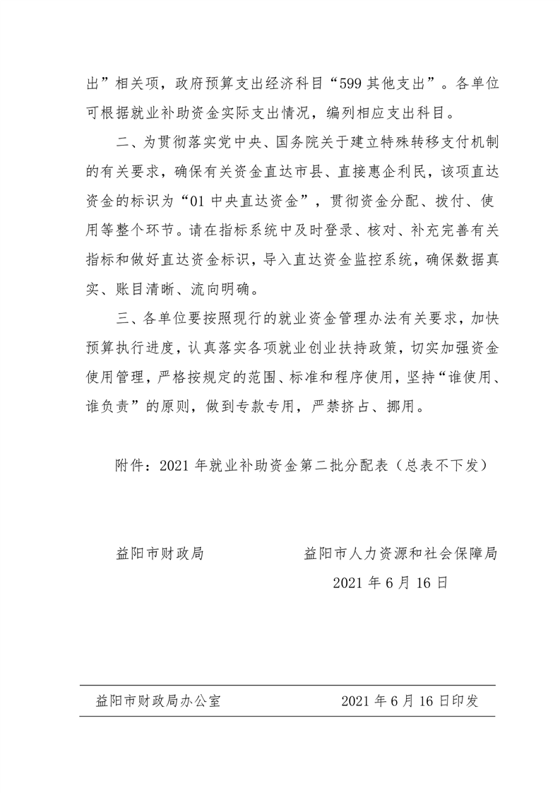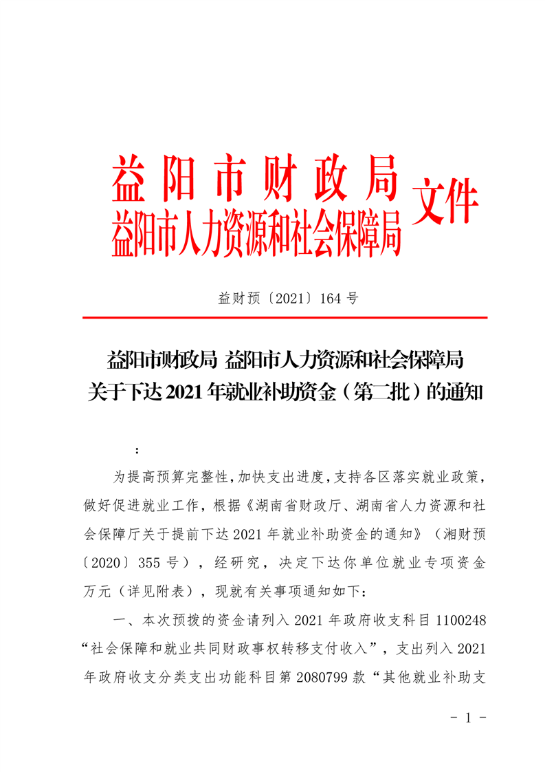 益阳市财政局 益阳市人力资源和社会保障局关于下达2021年就业补助资金(第二批)的通知
