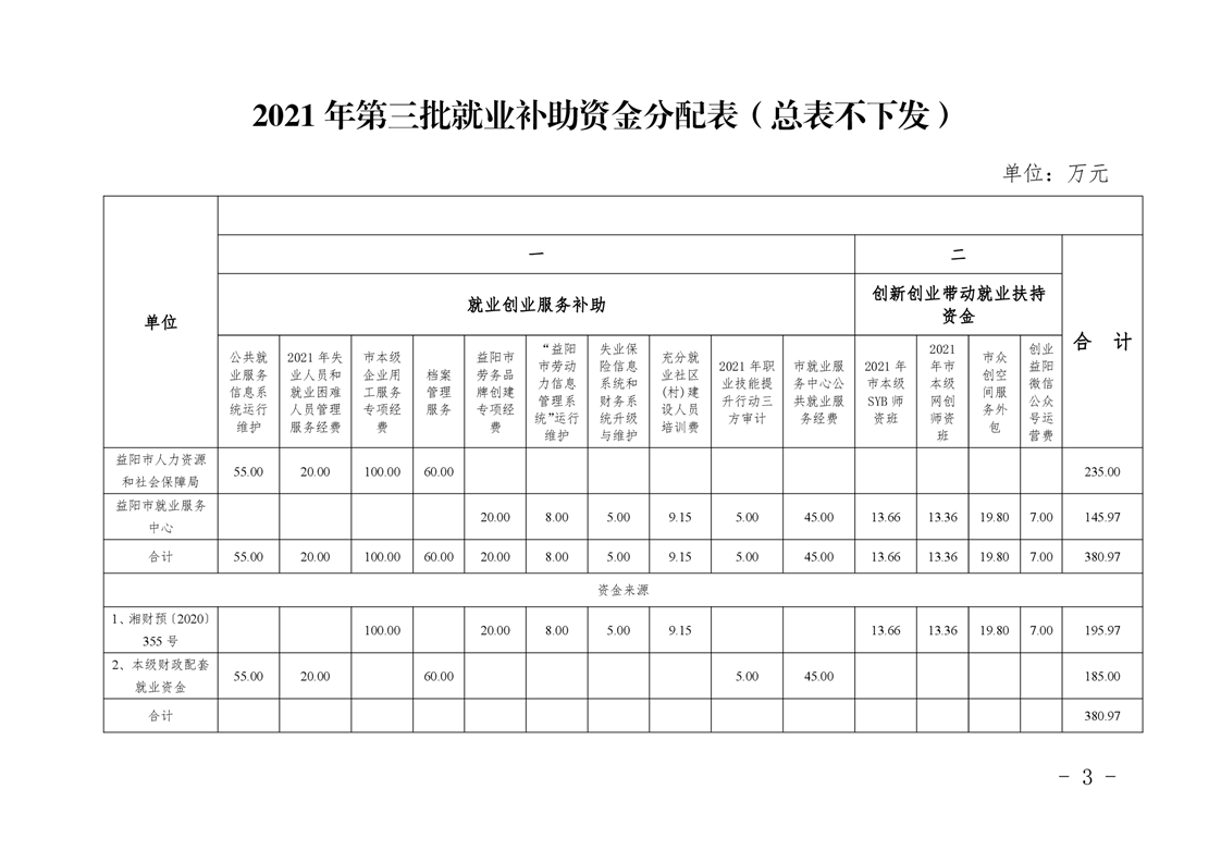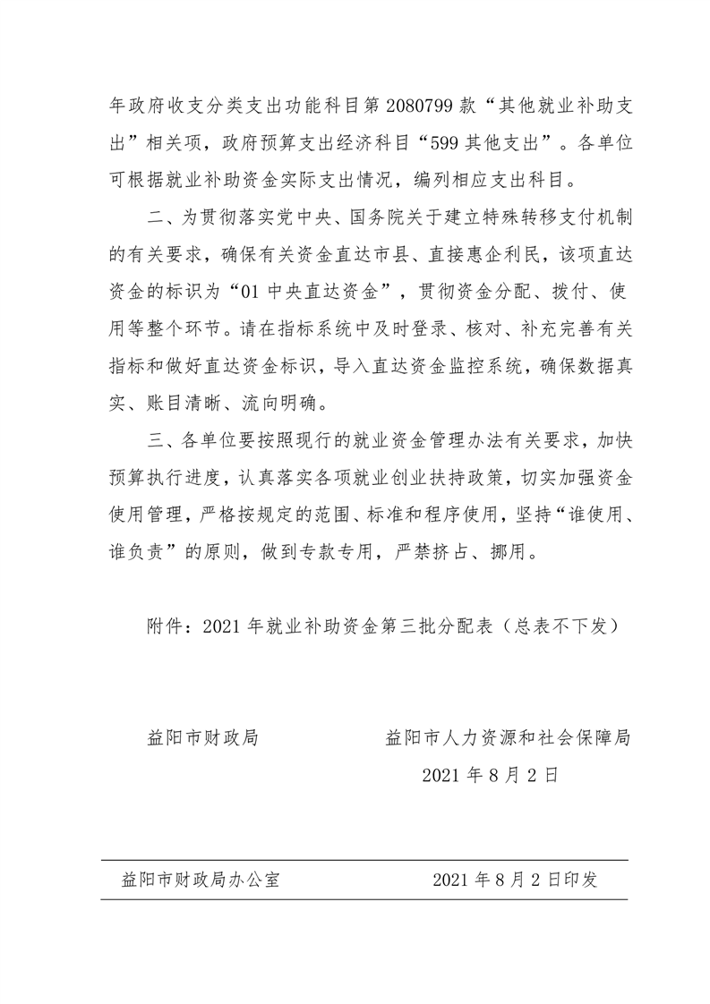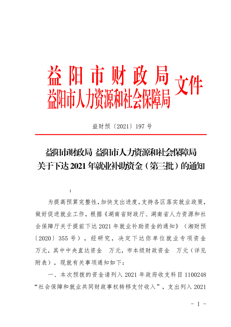 益阳市财政局 益阳市人力资源和社会保障局关于下达2021年就业补助资金(第三批)的通知