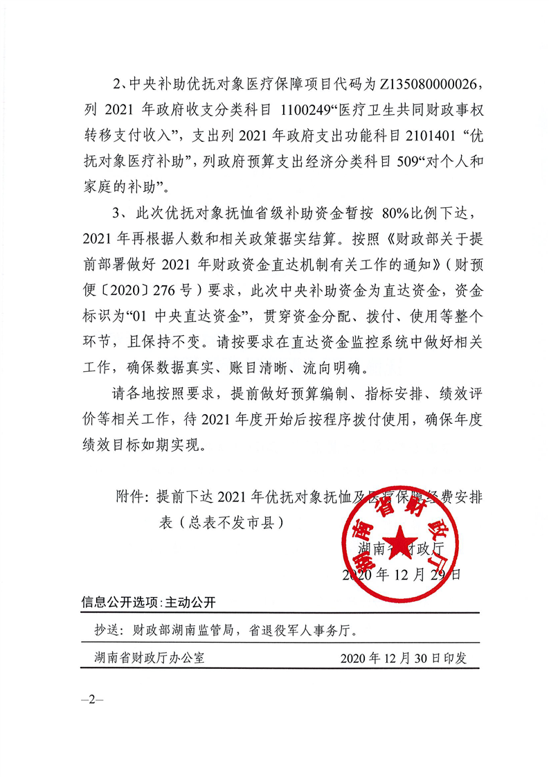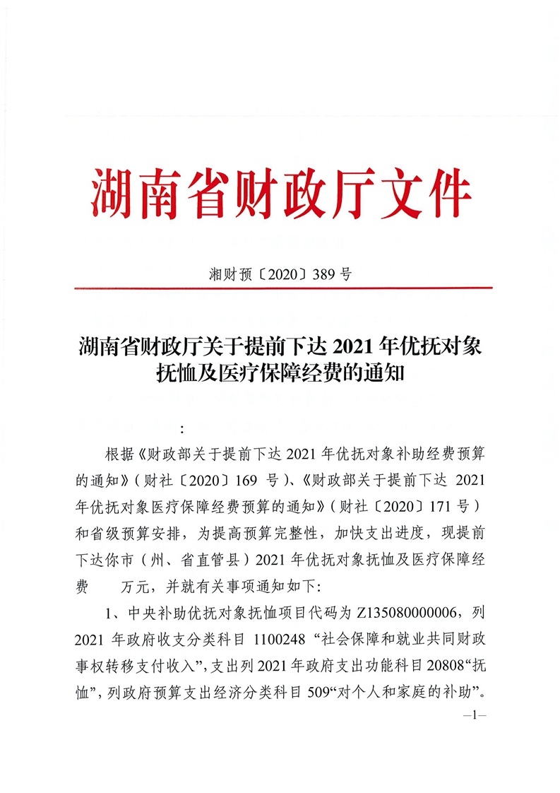 湖南省财政厅关于提前下达2021年优抚对象抚恤及医疗保障经费的通知