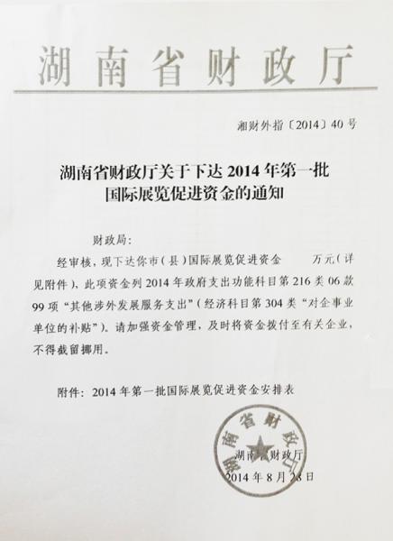 湖南省财政厅关于下达2014年第一批国际展览促进资金的通知