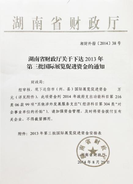 湖南省财政厅关于下达2013年第三批国际展览促进资金的通知