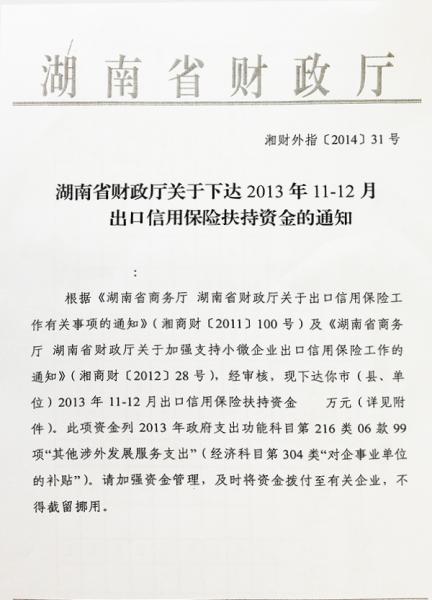 湖南省财政厅关于下达2013年11月-12月出口信用保险扶持资金的通知