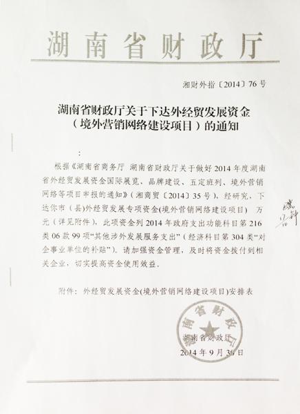 湖南省财政厅关于下达外经贸发展资金(境外营销网络建设项目)的通知