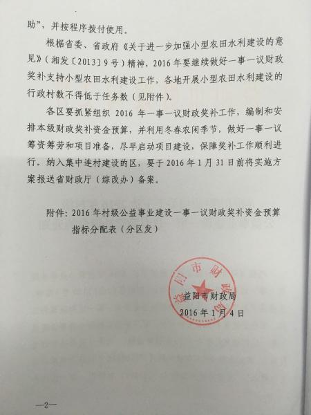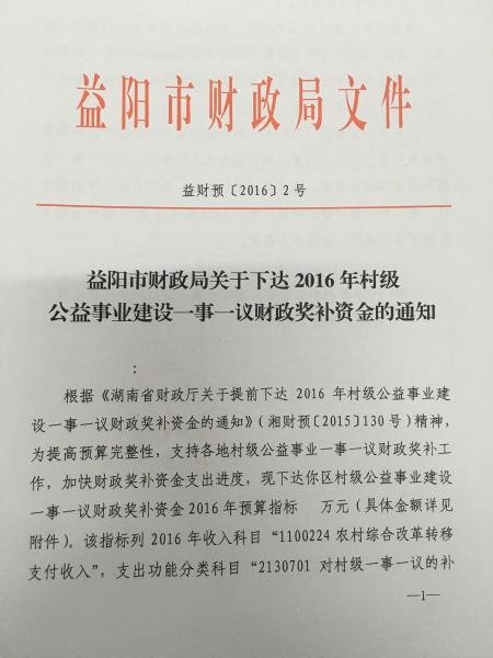 益阳市财政局关于下达2016年村级公益事业建设一事一议财政奖补资金的通知