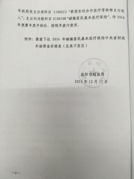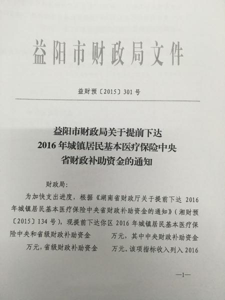 益阳市财政局关于提前下达2016年城镇居民基本医疗保险中央省财政补助资金的通知