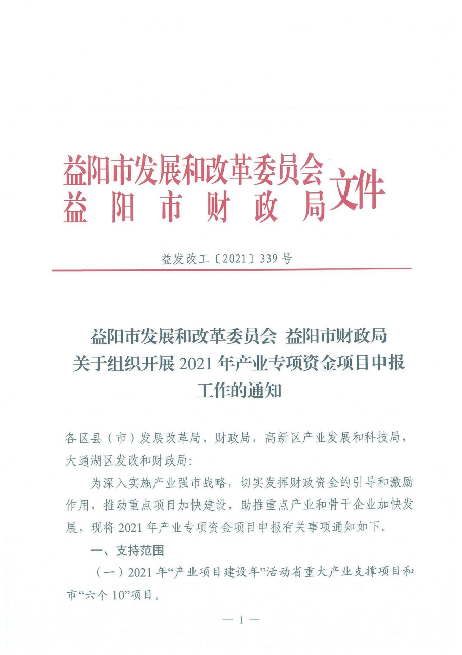 【通知公告】关于组织开展2021年产业专项资金项目申报工作的通知(益发改工〔2021〕339号)