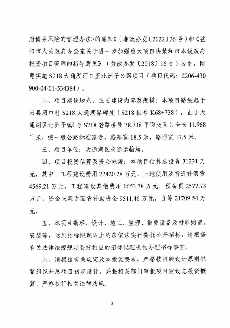 关于S218大通湖河口至北洲子公路项目可行性研究报告的批复