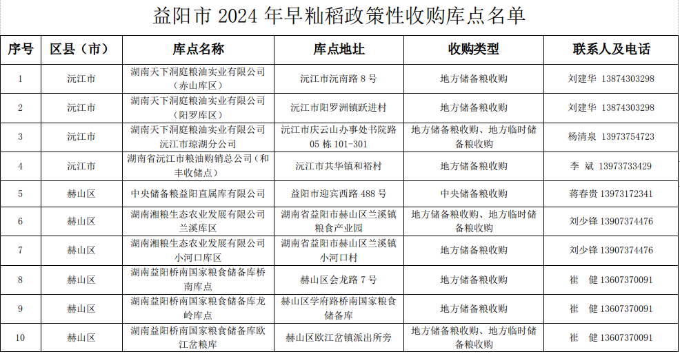 为切实做好2024年全市早籼稻收购工作,现将早籼稻政策性收购库点公布如下,请广大售粮群众就近售粮,并对各库点收购行为及服务进行监督。