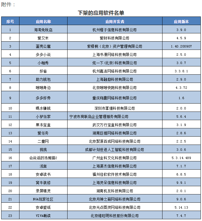 8月31日,工信部向社会通报了101家存在侵害用户权益行为APP企业的名单。截至2020年9月14日,经第三方检测机构核查复检,尚有23款APP未按要求完成整改(名单见附件)。依据《网络安全法》和《移动智能终端应用软件预置和分发管理暂行规定》(工信部信管〔2016〕407号)等法律和规范性文件要求,工信部已组织对上述APP进行下架。