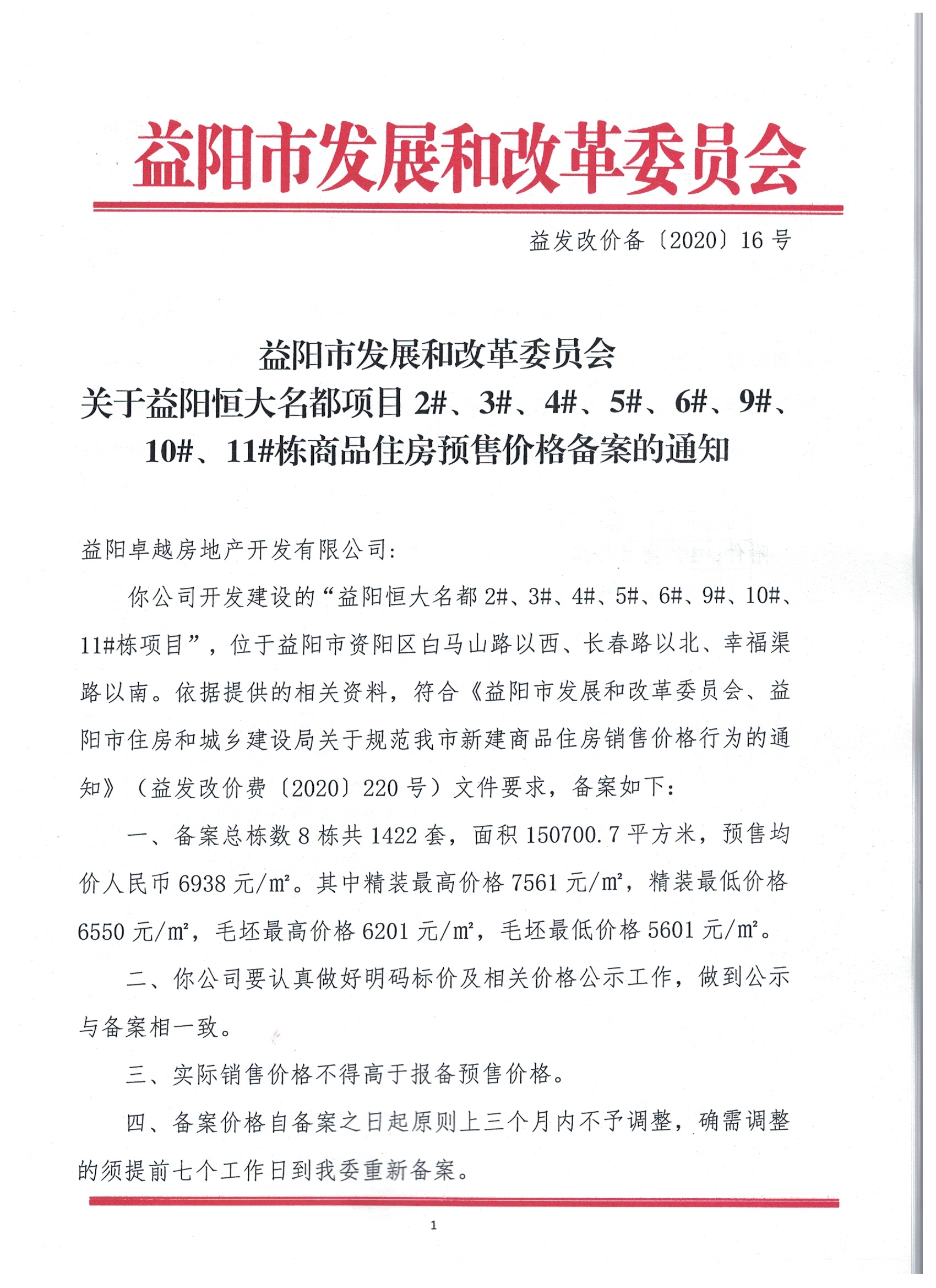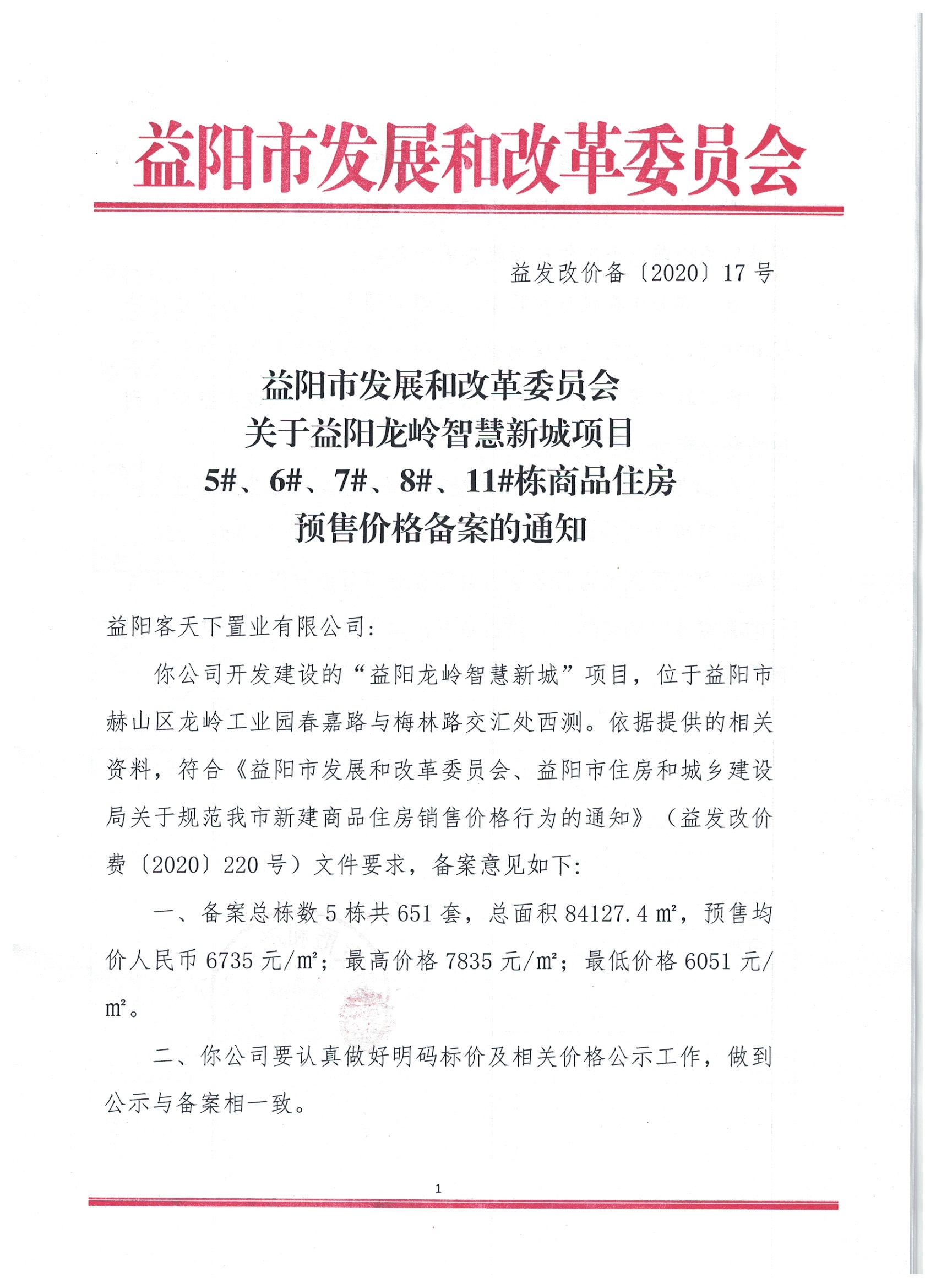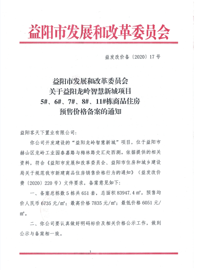 17号 关于益阳龙岭智慧新城项目5#、6#、7#、8#、11#栋商品住房预售价格备案的通知.docx