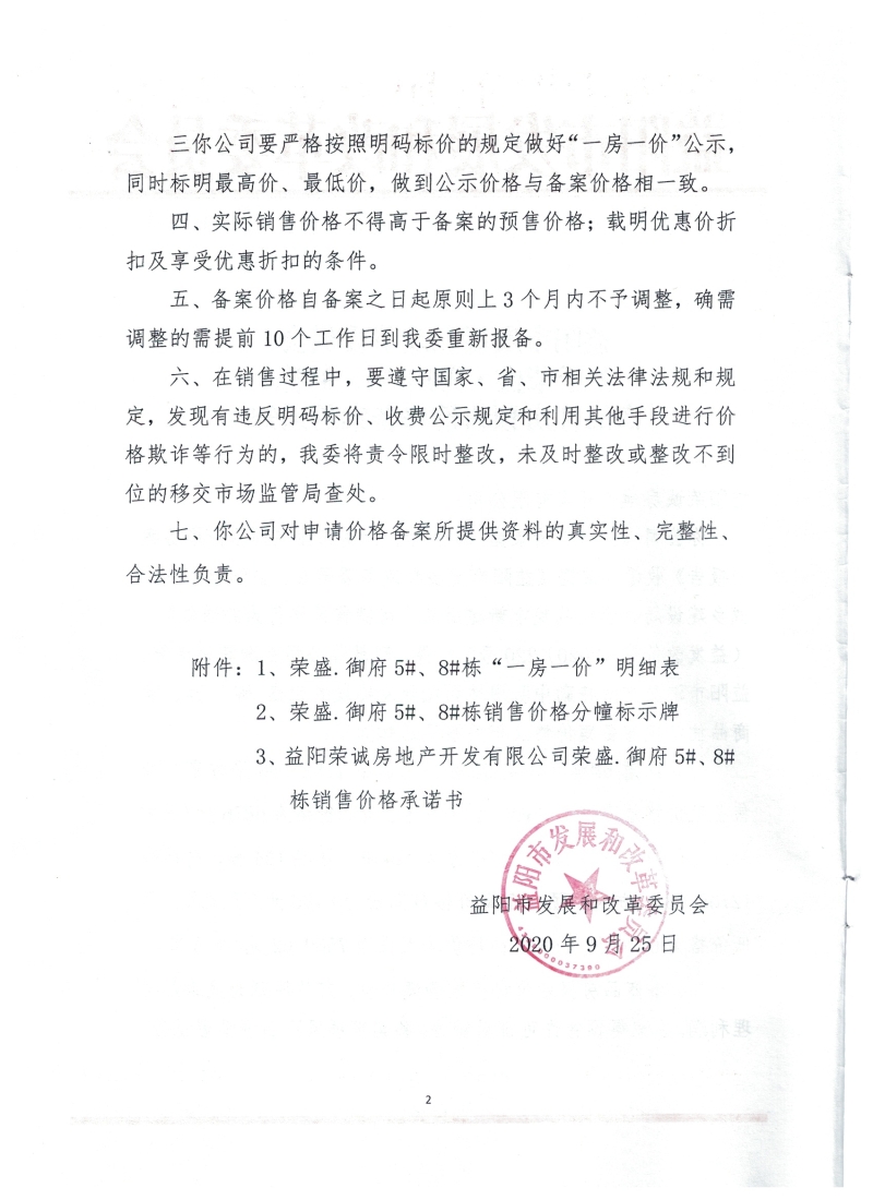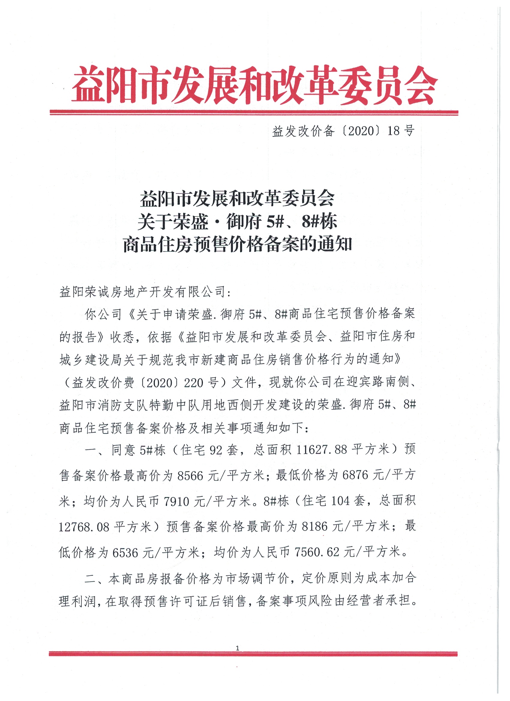 18号 关于荣盛·御府5#、8#栋商品住房预售价格备案的通知.docx