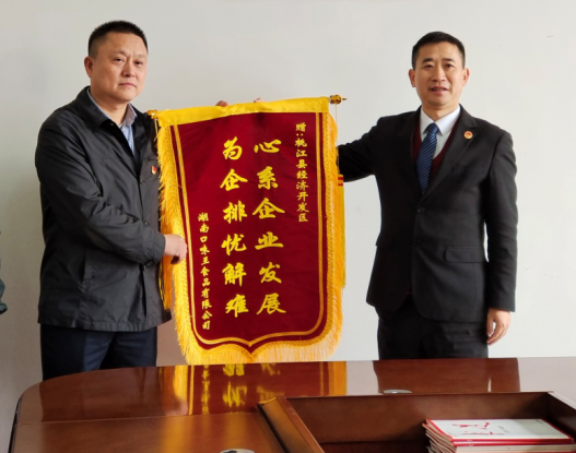 “衷心感谢你们为企业提供了优质的服务,解决了我们企业用工需求。”4月15日,湖南口味王食品有限公司桃江基地总经理文先宁将一面绣有“心系企业发展,为企排忧解难”的锦旗送到了桃江经开区管委会主任曾钰彬手中,感谢园区一直以来的贴心服务和精准帮扶。