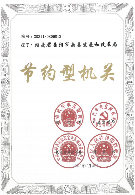日前,南县发展改革局被国家机关事务管理局、中共中央直属机关事务管理局、国家发展和改革委员会、财政部等四部门联合评为“节约型机关”称号。