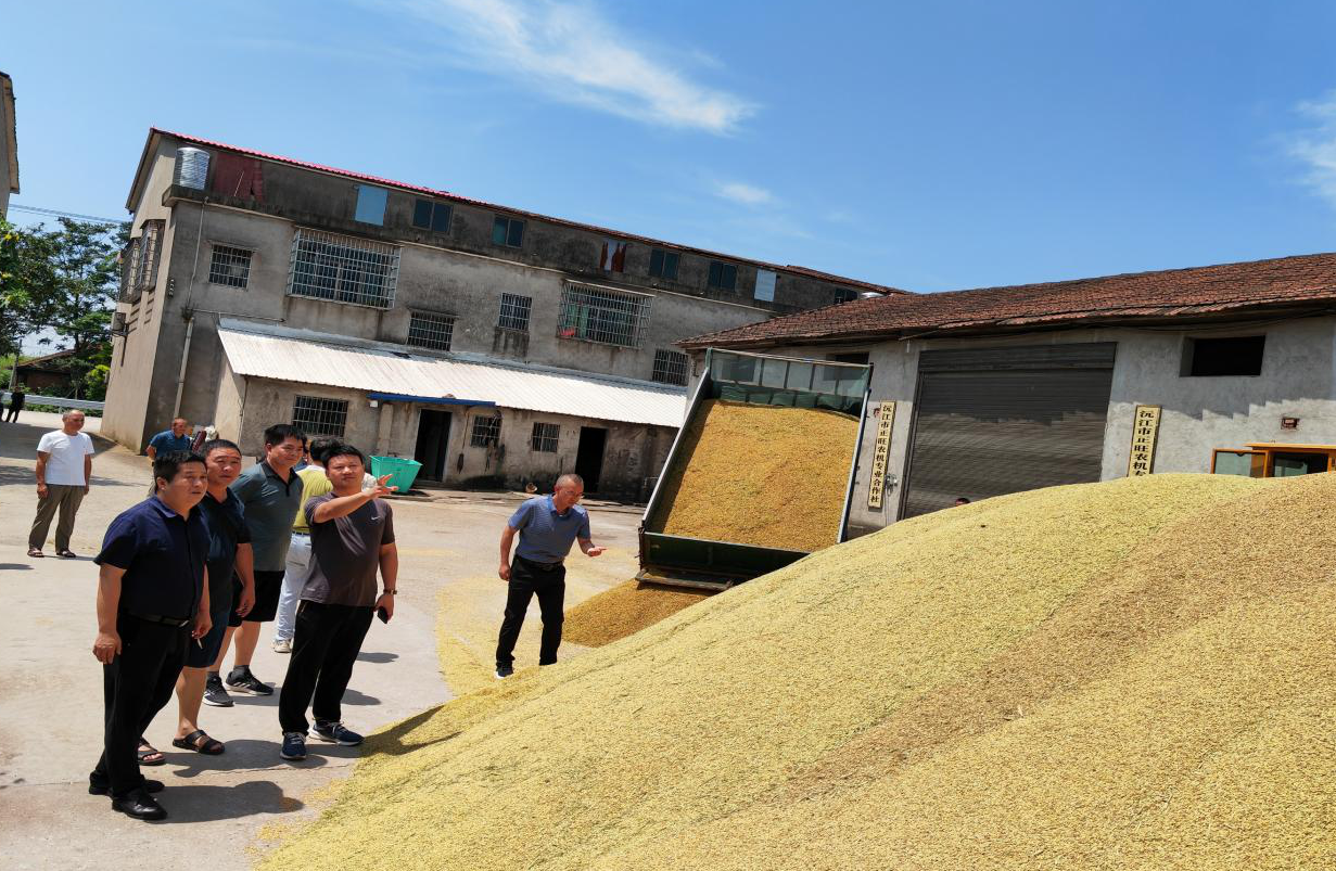 调研组在沅江市正旺农机专业合作社查看粮源,问询早稻市场行情