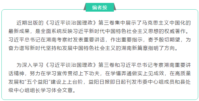 《习近平谈治国理政》第三卷最集中、最全面展现了党的理论创新、实践创新、制度创新成果,是标志马克思主义中国化实现新飞跃的光辉著作。习近平总书记考察湖南重要讲话,为湖南发展锚定的新坐标、明确的新定位、赋予的新使命,是我们谋划推动“十四五”乃至更长时期发展的指导思想。我们要坚决扛牢学好用好第三卷的政治责任,认真学习贯彻习近平总书记重要讲话精神,真正学懂、弄通、做实,让党的创新理论的“真理光辉”转化为推动益阳高质量发展的强大力量。