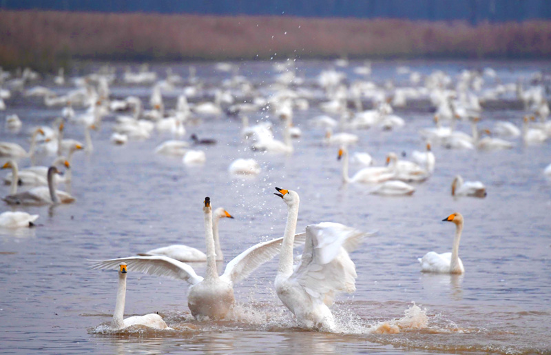 冬日里,河南省三门峡市天鹅湖国家城市湿地公园里,一只只白天鹅时而贴水滑翔,时而振翅冲上碧霄,悠然自得、野趣盎然。