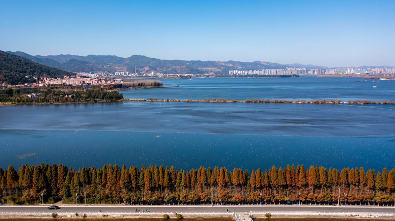 污染减少,云南昆明的高原明珠滇池正重新焕发光彩。随着滇池治理工作的不断深入,2022年滇池全湖水质持续向好,自2018年上升为Ⅳ类水质后,连续5年保持全湖水质Ⅳ类。