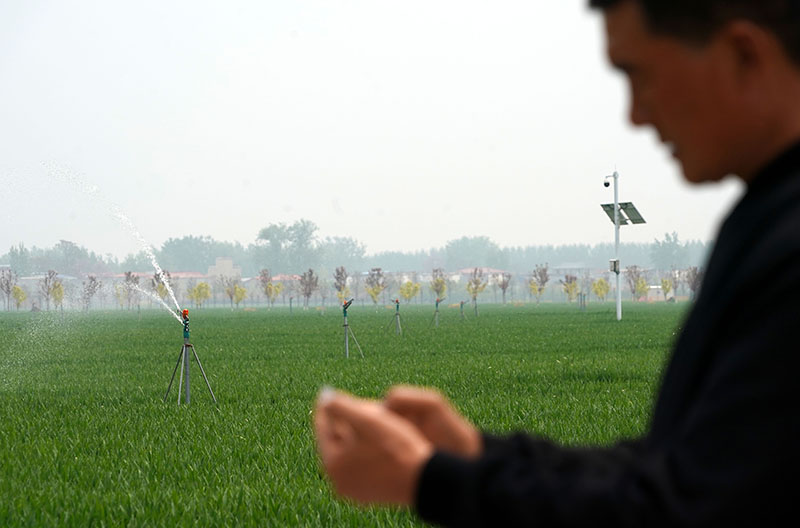 在河南省商水县张庄镇南陵村一处高标准农田里,种粮大户邱守先使用手机操控设备对小麦田进行喷灌(2022年4月14日摄)。新华社记者 李安 摄