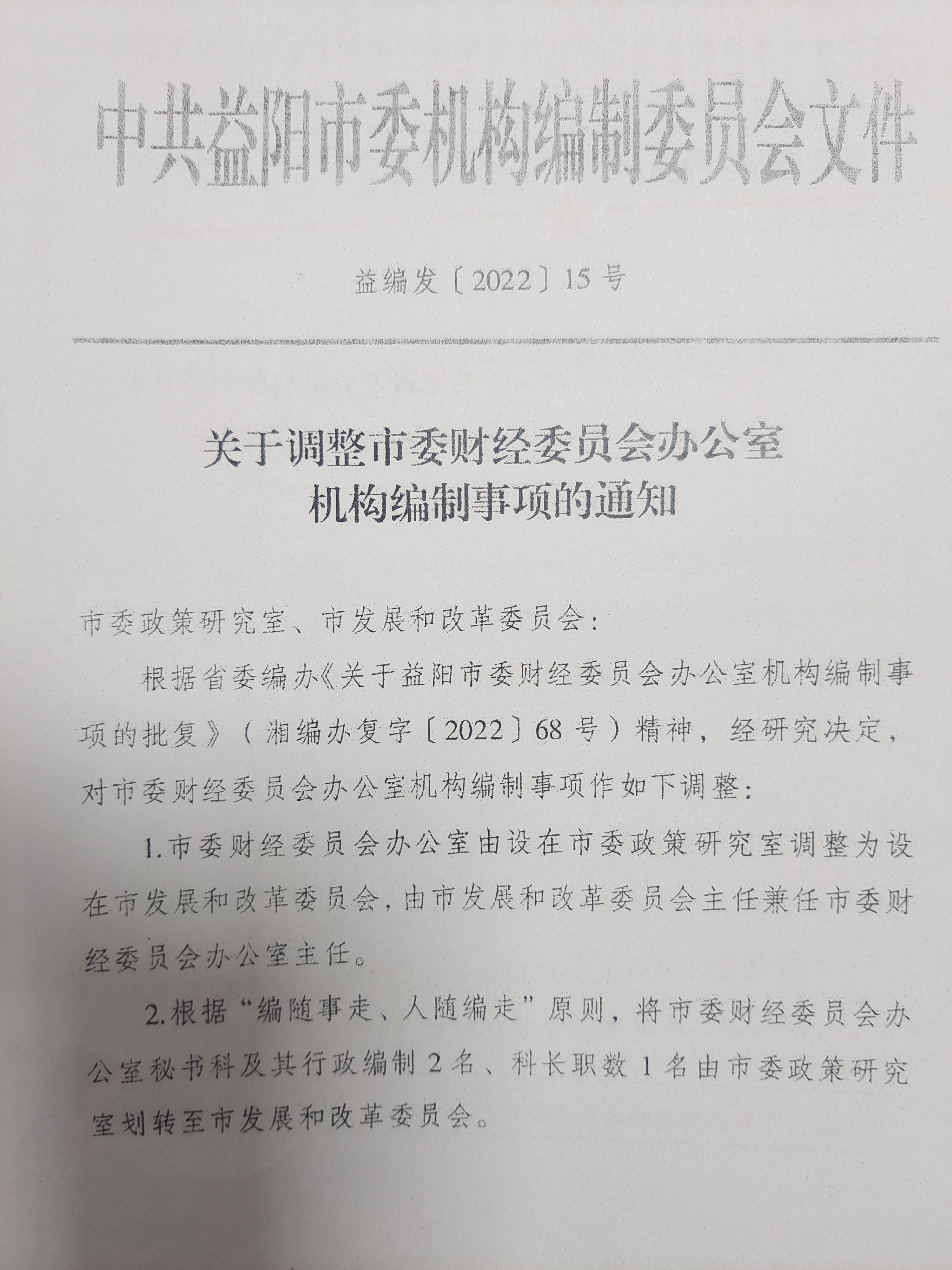 关于调整市委财经委员会办公室机构编制事项的通知