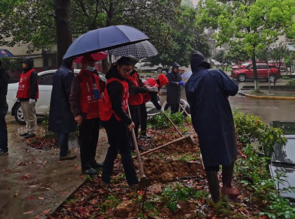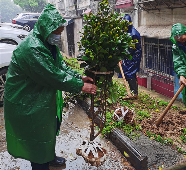 在植树现场,他们分工协作,两人一组或三人搭档,挖坑填土、栽苗扶正、提桶浇水,认真做好每一道工序,一片热火朝天的景象。原本多年没翻动且被行人踏走的土地被雨水浸湿后,挖坑和培土的时候增加了难度,大家不得不多用力气。可雨水没有浇灭大家的热情,“雨天植树还是第一次。”一位志愿者擦擦脸上的雨水说。