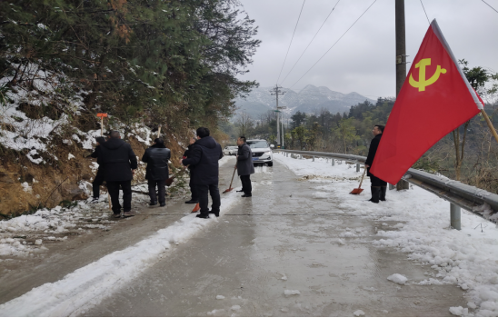 鲜红的党旗在清水村的乡村公路上飘扬,沿线群众纷纷向胸前佩戴着党徽干得热火朝天的党员们点赞,许多群众自觉地加入到清雪扫障队伍中来,人员越来越多,个个汗流浃背。经过大家的共同努力,确保了村民安全出行,村域内616乡道、X015县道等公路沿线畅通。