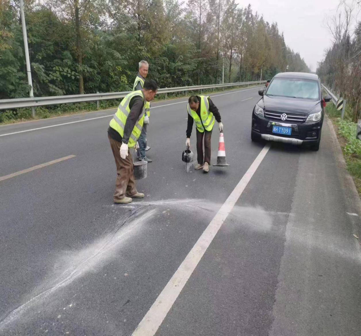 省道S217是茅草街西洲匝道桥至厂窖镇路段的重要通道,也是全省的红色爱国教育基地,前来参观的客流、车流量较大,导致公路路面出现裂缝,影响行车安全。我中心高度重视,采用沥青灌缝处理,并严格按照“清缝、灌缝、撒沙、清场”的公路养护安全作业规程进行养护作业。养护现场,养护作业人员身穿公路养护作业标志服、规范设置安全警示标志、锥形筒,正确引导车辆有序通行。经过三天的公路路面裂缝病害处置,共投入人工15人次,工程机械6台班,完成路面裂缝处置1800米。