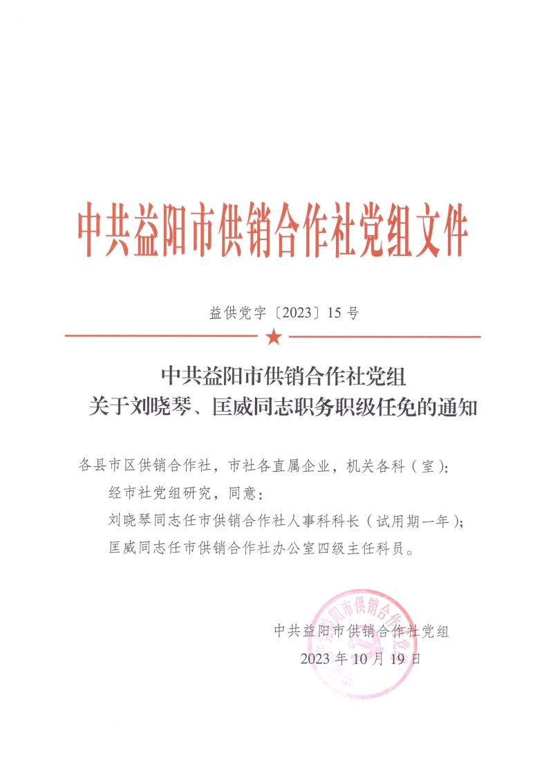 中共益阳市供销合作社党组关于刘晓琴、匡威同志职务职级任免的通知