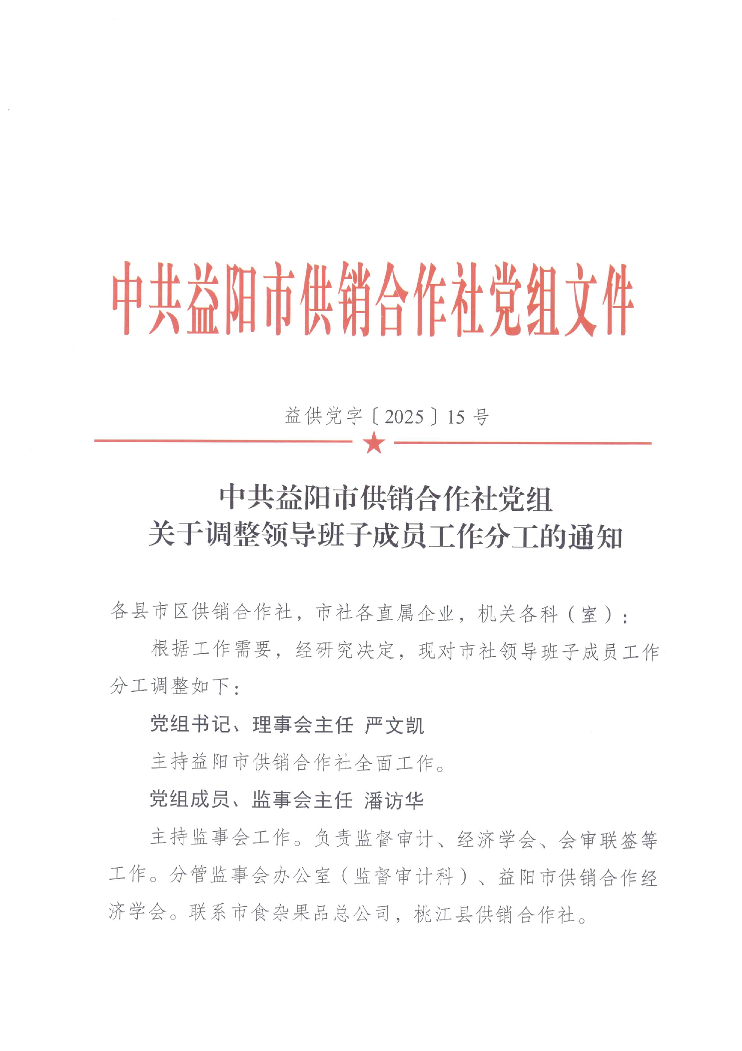 中共益阳市供销合作社党组关于调整领导班子工作分工的通知