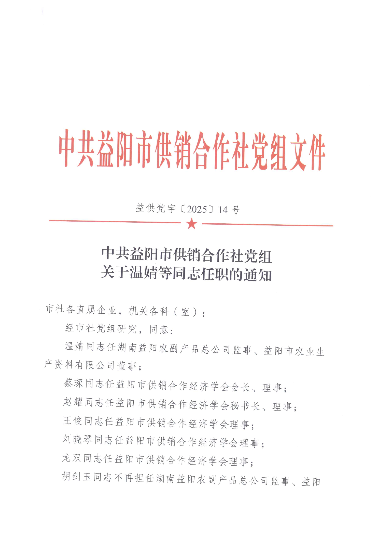中共益阳市供销合作社党组关于温婧等同志任职的通知