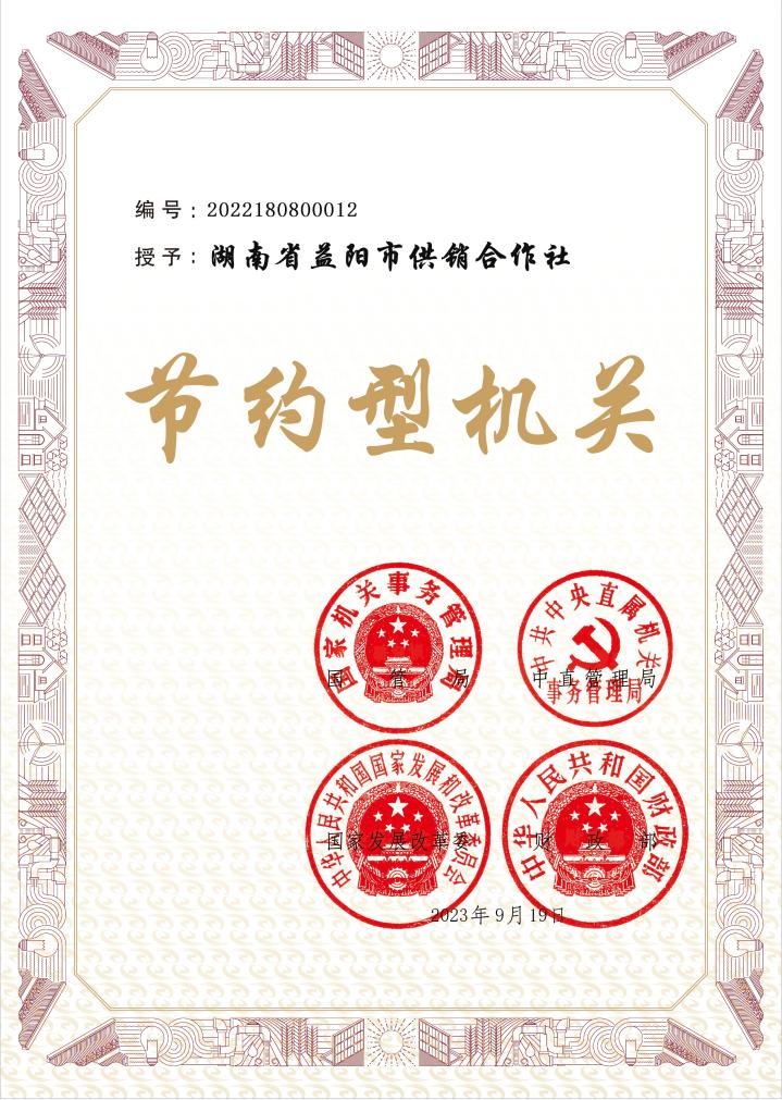 近日,益阳市供销合作社被国家机关事务管理局、中共中央直属机关事务管理局、国家发改委、财政部联合授予“节约型机关”荣誉称号并颁发荣誉证书。