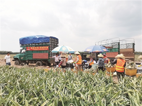 眼下,正是菠萝飘香的丰收时节。只见戴着斗笠、全副武装的果农正忙地采摘着,再将一筐筐菠萝装运到等候在地头的大挂车或冷链车上。“徐闻农民‘致富果’乡村振兴‘希望果’”的车身横幅与满眼丰收景象交相呼应,寄托着果农对增收致富的美好期许。