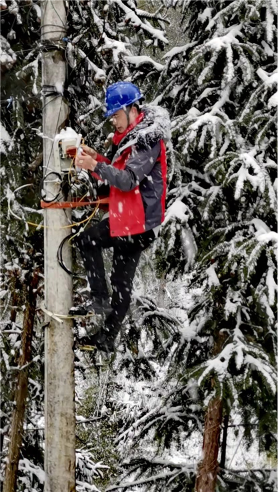2月8日,正月初八,又一轮暴雪过后,安化清塘铺镇红岩村周家冲大雪压断树木导致光缆中断,安化分公司技术人员冒着鹅毛大雪,爬上冰冷的电杆,开展紧急抢修。