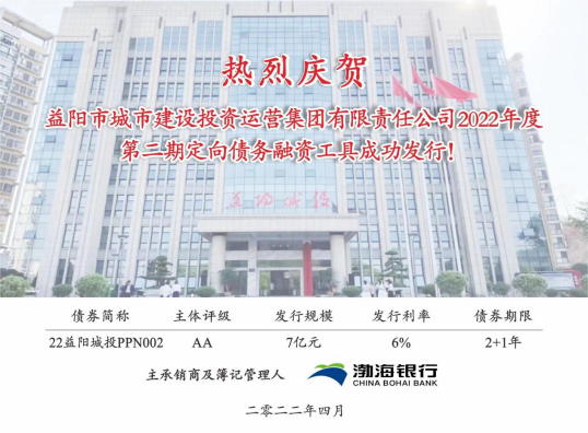 2022年4月14日,由益阳市城投集团为发行主体,渤海银行作为主承销商的益阳市城市建设投资运营集团有限责任公司2022年第二期定向债务融资工具“22益阳城投PPN002”在中国银行间交易商协会成功发行,发行规模7亿元,期限2+1年,票面利率6.0%。