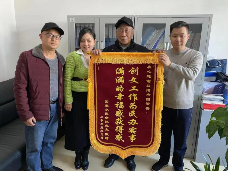 小区居民将一面印有“创文工作为民办实事满满的幸福感获得感”的锦旗送到市国资委办公室。