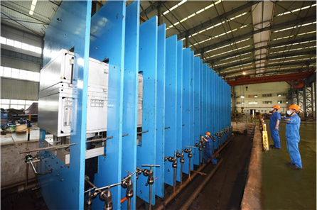 益阳橡机生产的平板硫化机系列产品,在国内市场一直保持行业领先的地位,产品远销美国、日本、巴西、南非、乌兹别克斯坦以及东南亚国家和地区。在此前10米等中、大型平板硫化机市场饱和的大趋势下,该公司坚持技术创新,不断转型升级,先后解决了制造超大型平板硫化机热板深度钻孔、对接埋弧焊双面焊接、大型薄壁框架类构件及大型热板应力集中和热变形难题的技术瓶颈,确保了16米超大型平板硫化机两热板的平行精度,加快产品向超大型的转型升级,以引领平板硫化装备制造业向更加节能、高效率、智能化等超大型平板硫化机发展。