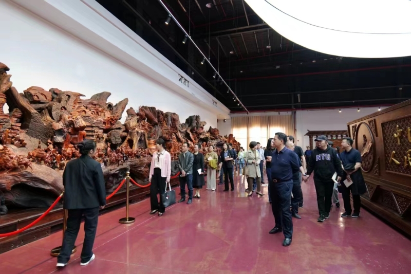 图为家属代表参观天意木国廉政根雕展览现场
