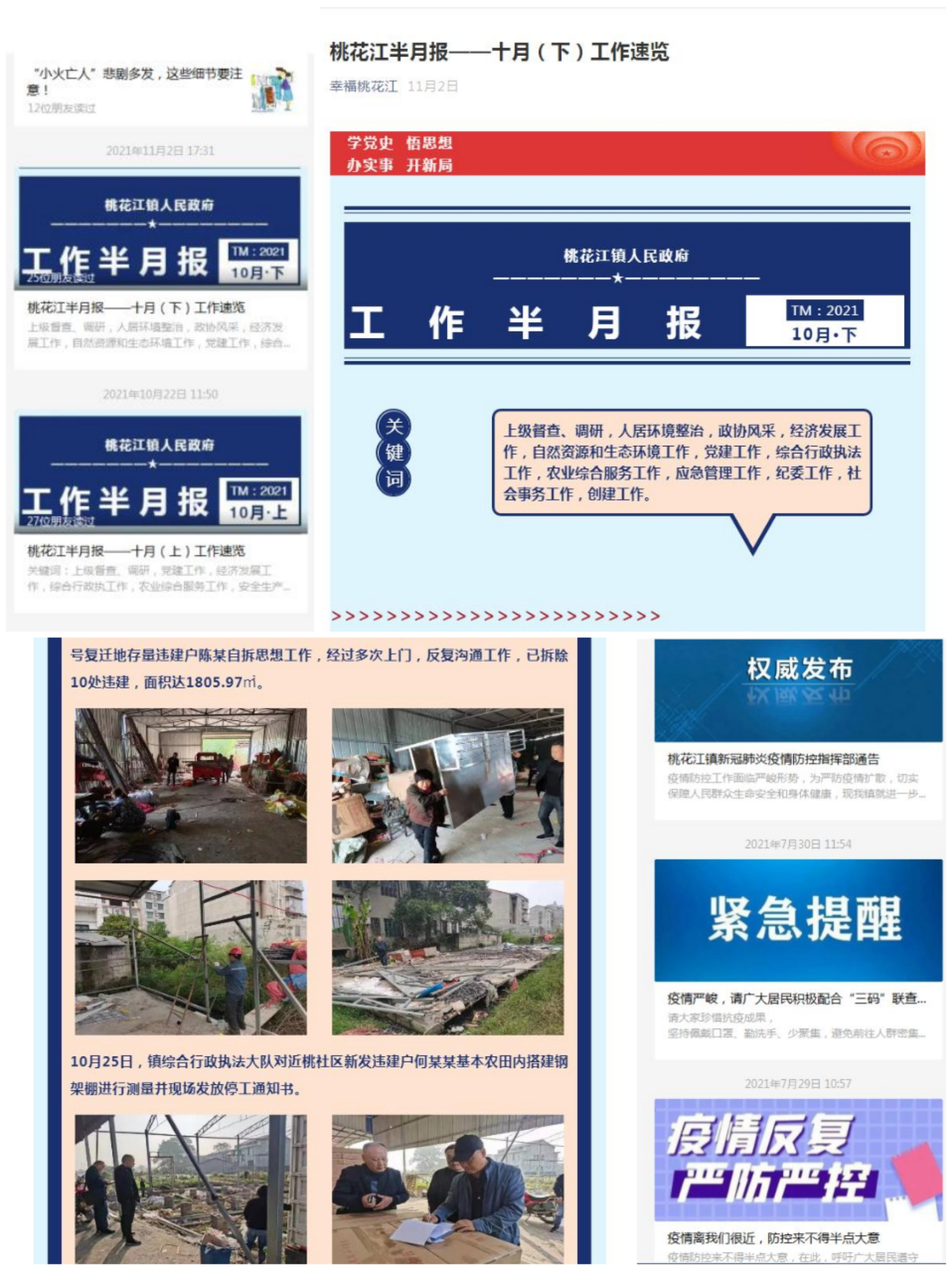 一是政务公开形式多样化。实行“线上+线下”双公开模式,综合运用网络和便民服务中心两个平台切实推行政务公开。拓展政府网站功能,加强政府门户网站建设,通过“幸福桃花江”微信公众号,以半月刊的形式,主动公开办站所办事程序及工作牌、镇内重大会议、民生政策等各类信息;通过“便民服务中心”做好群众关心的医疗卫生、社会保障、劳动就业、法律规范、农村基层民主权利等公共服务类信息公开。目前,全镇已组建1个镇便民服务中心、31个村(社区)便民服务点。全年运用LED电子显示屏及时公开政务信息;建立高标准的宣传栏和公示墙,做到事事有公开,件件受监督。搭建“阳光政务”平台,认真做好电话热线和网络信箱办理工作,促进政民互动沟通。