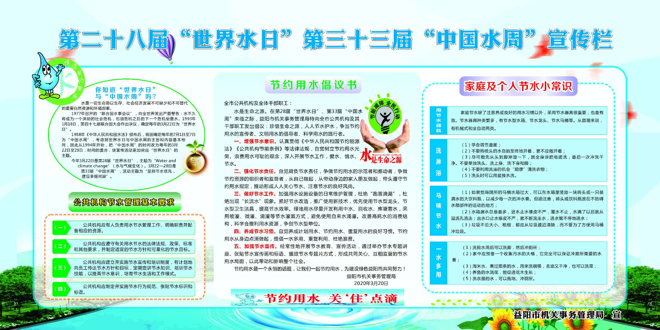 在第28届“世界水日”、第33届“中国水周”来临之际,益阳市机关事务管理局以“人人参与节水爱水,共建绿水青山家园”为主题,开展了多形式、多渠道的宣传,用实际行动倡导“坚持节水优先,建设幸福河湖”的节水行动。