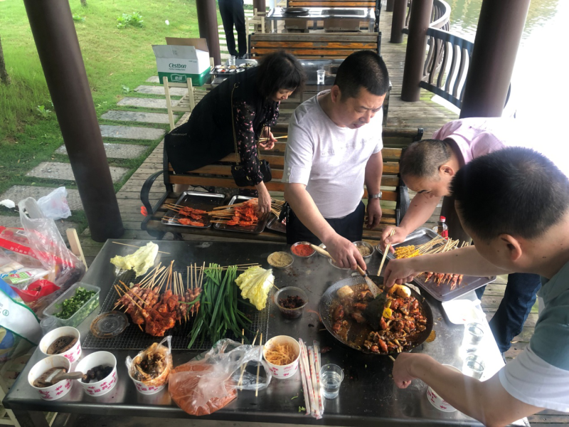 虽然天空下着淅沥沥的小雨,但完全没有影响到大家参加活动的热情。陆续到达活动地点后大家把准备好的食材拿出来,准备来一个烧烤大餐!大家分工合作,都忙得不亦乐乎!开烤并不那么顺利,要么火上不来,要么就火大烤糊,但是大家仍然有说有笑、不急不躁、慢慢摸索,终于,烧烤架上传来了阵阵香气,你一串我一串,大家都迫不及待品尝起来。“哇,好吃极啦!”大伙围坐在一起,一边吃着美味的烧烤,一边谈笑风生,好不欢乐。