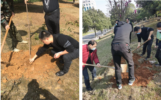 植树活动现场热火朝天,定位、挖坑、搬苗、培土、踩实、浇水......大家分工合作、干劲十足。在共同的努力下,共种下乔木红花玉兰20株、金丝楠木20株;灌木红叶石楠1000株、春杜鹃200株。