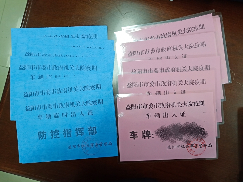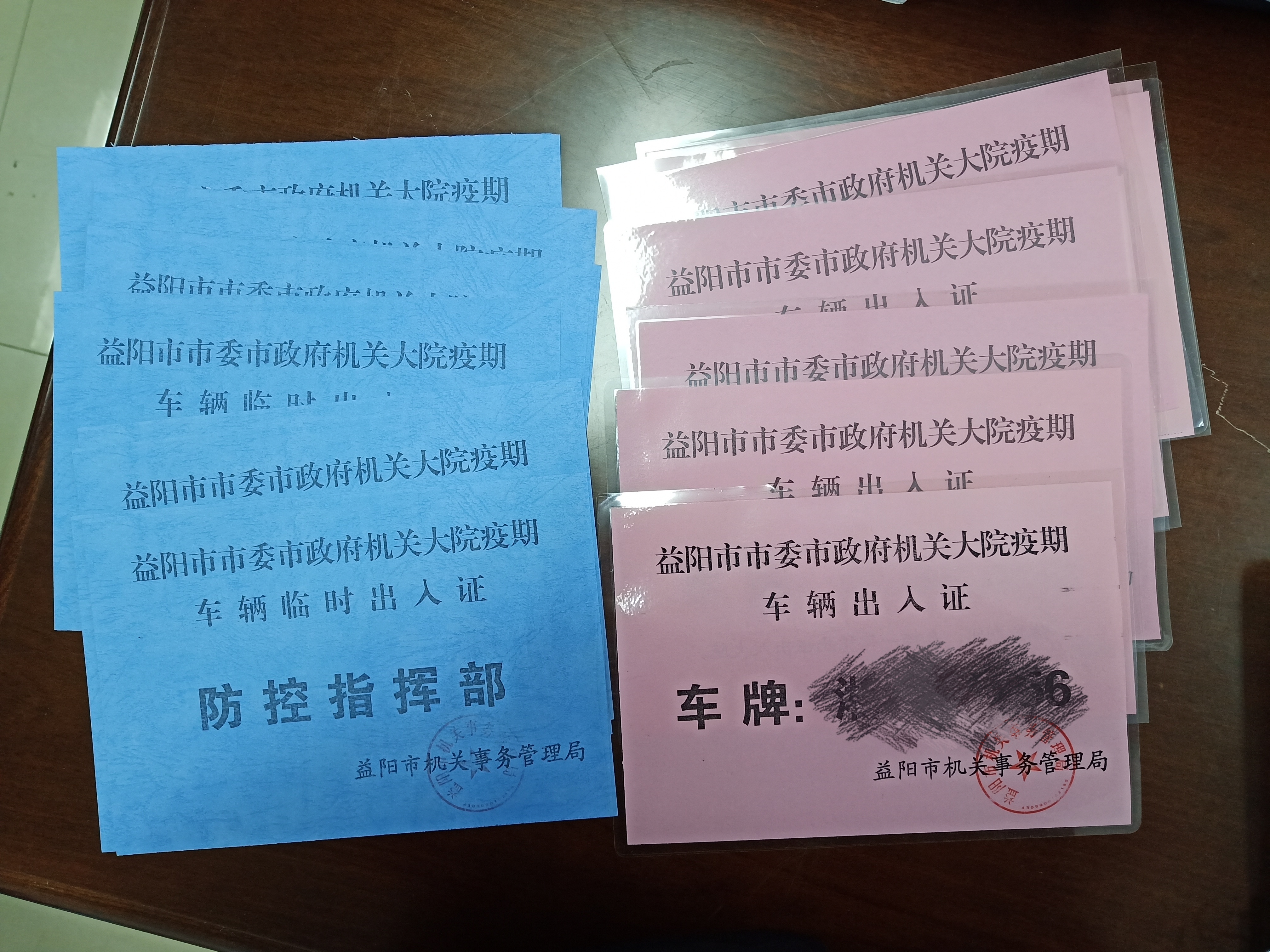 截至目前,益阳市机关事务局为驻院各单位发放红色“疫期车辆出入证”共1100余张,为院外市直单位及防控领导小组成员单位制作发放蓝色“疫期车辆临时出入证”200余张。