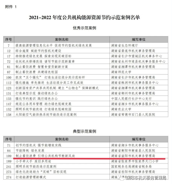近日,国家机关事务管理局发布2021-2022年度公共机构能源资源节约示范案例,全国共483个案例入选,其中,市机关事务管理局报送的《制止餐饮浪费 引领公共机构节粮新风尚》案例获评典型示范案例。