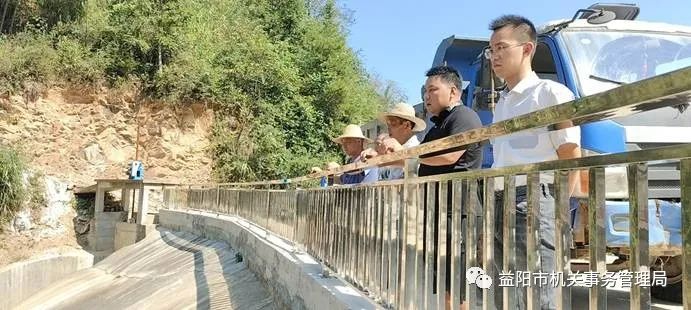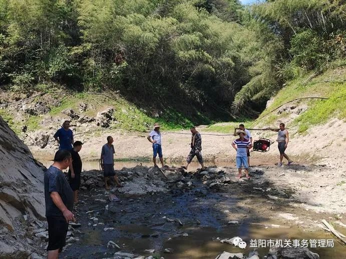 8月18日,安化县机关事务服务中心派驻滔溪镇梅兰坪村乡村振兴工作队队员,头顶烈日,冒着41度高温到梅兰坪村黄梅水库查看水位并寻找水源,组织力量架设管道,力求尽快解决村民用水难题。