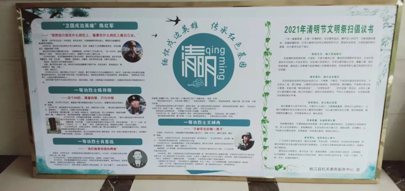人间四月芳菲始,又是一年清明时。为深入开展党史学习教育,缅怀先烈、弘扬英烈精神、传承红色基因,桃江县机关事务服务中心举办《缅怀戍边英雄 传承红色基因》事迹展活动。
