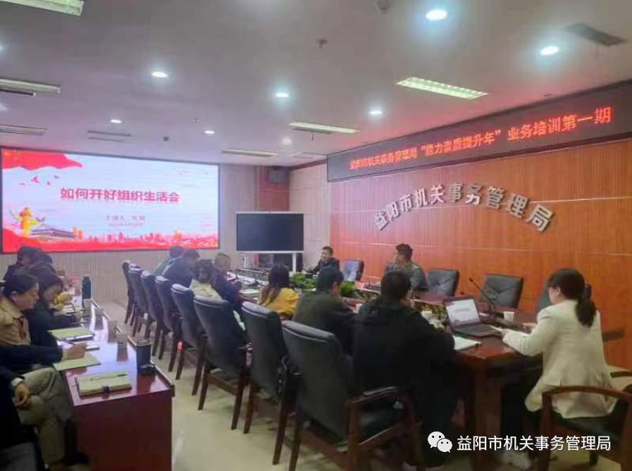 4月28日下午,益阳市机关事务管理局2023年“能力素质提升年”行动之“业务课堂”正式开讲,局机关党委委员罗娟以《如何开好组织生活会》为题为全体干职工授课,从专业名词概述和关系、会议流程及注意事项两个方面详细地解读了组织生活会。局党组书记、局长陈瑶出席会议,局全体干职工参加,市委组织部督导组现场观摩、指导工作。课堂由局党组成员、副局长项继才主持。