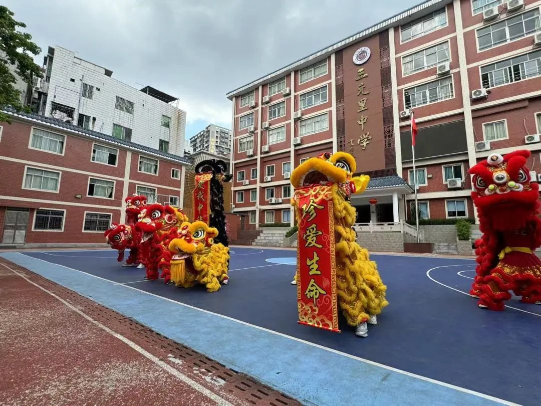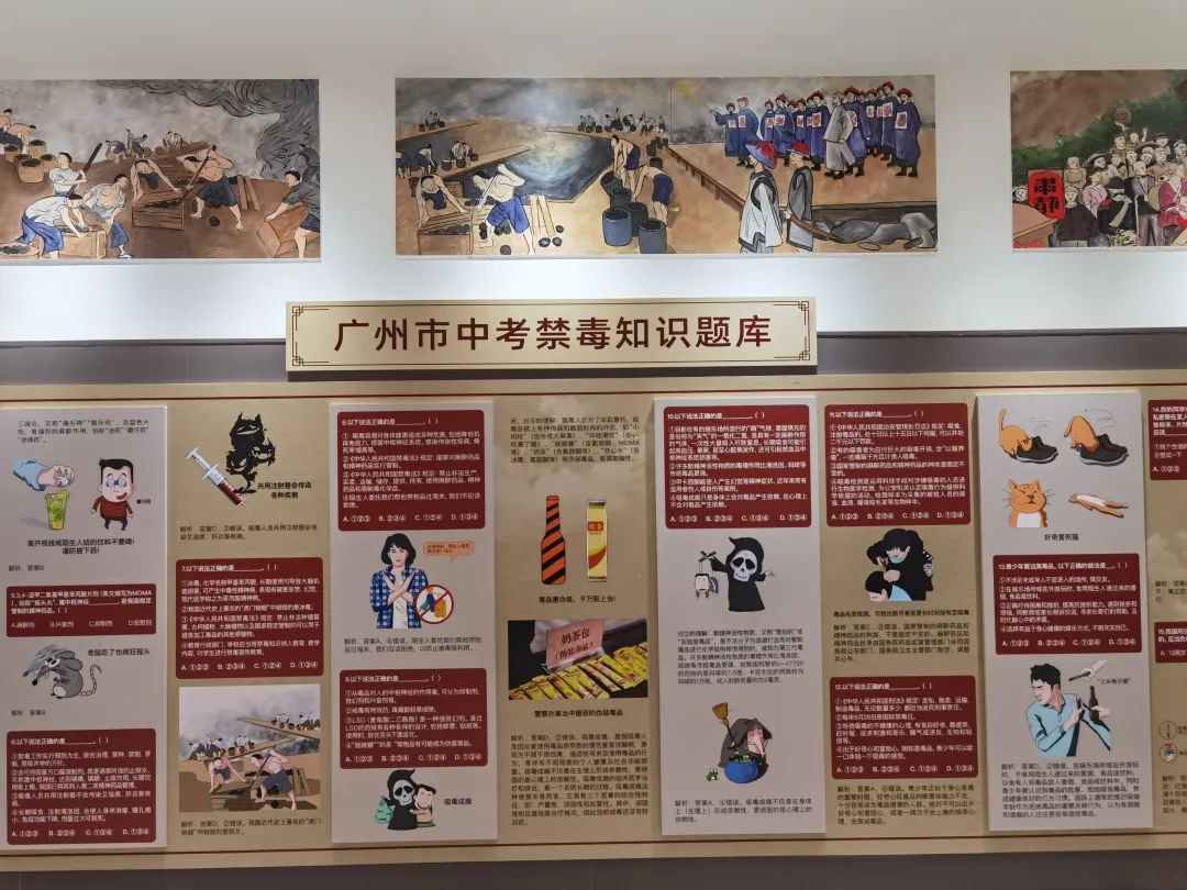 三元里中学重点展示了“禁毒知识进中考”机制、“禁毒送展进校园”以及禁毒元素融合三元里传统文化节目表演。三元里中学禁毒教育中心以图文漫画的形式,展示了广州市“禁毒知识进中考”机制。自2018年起,广州市率先在全省实现了“禁毒知识进中考”,科学地建立20道题的题库并公布,每年中考从中随机抽取2题共4分,促进了学校毒品预防教育的开展。三元里中学以图片、案例等形式集中展示了防范青少年药物滥用主题的各类展板,有效提升在校学生对“依托咪酯”“右美沙芬”等麻精药品滥用的防范意识。三元里中学校长余显义介绍,学校还将禁毒教育与培养学生健康体魄相结合,自创禁毒操、醒狮操,培养学生在继承三元里抗英斗争精神的同时,进一步锻炼强健体魄和坚强意志。