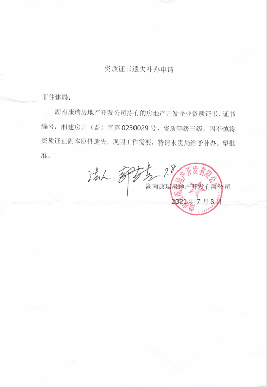 湖南康瑞房地产开发有限公司资质证书正、副本遗失,声明作废