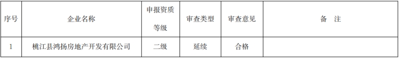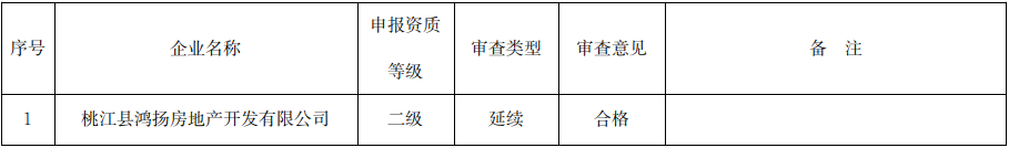 根据《住房和城乡建设部关于修改<房地产开发企业资质管理规定>的决定》(建设部令第54号)、湖南省住房和城乡建设厅《关于做好房地产开发企业资质改革工作的通知》(湘建法【2022】59号)、益阳市住房和城乡建设局《关于做好房地产开发企业二级资质核定及换发工作的通知》(益建发【2022】46号)等相关规定,现将桃江县鸿扬房地产开发有限公司等1家房地产开发企业资质审查情况予以公示(见附件)。公示期为2026年3月14日至2026年3月18日。